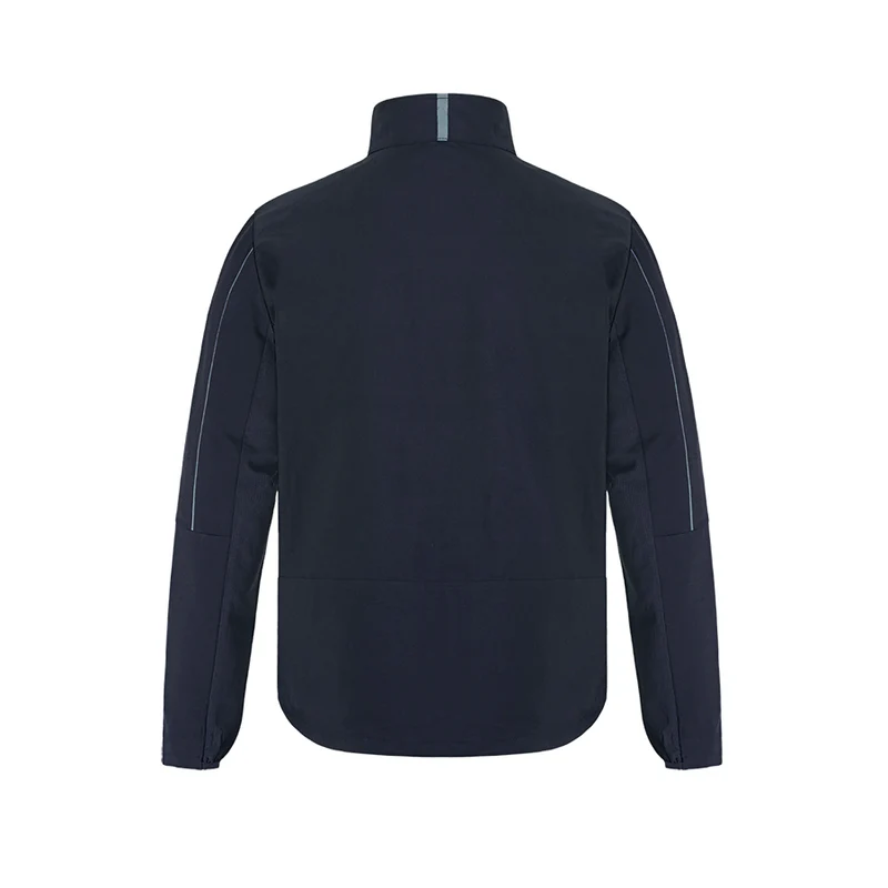 220 gsm - 6.5 oz./yd² - 10.8 oz./lin.yd 91% recycled polyester, 9% elastane 4-way stretch woven fabric with water repellent finish. Woven mesh trim fabric under the arms and side body for ventilation. Reflective trim on back of collar and sleeve. Elastic trim at sleeve cuff. YKK front zipper closure and lower front zippered pockets. Reflective zipper pulls at lower front pockets. Integrated packable pouch. Unlined.