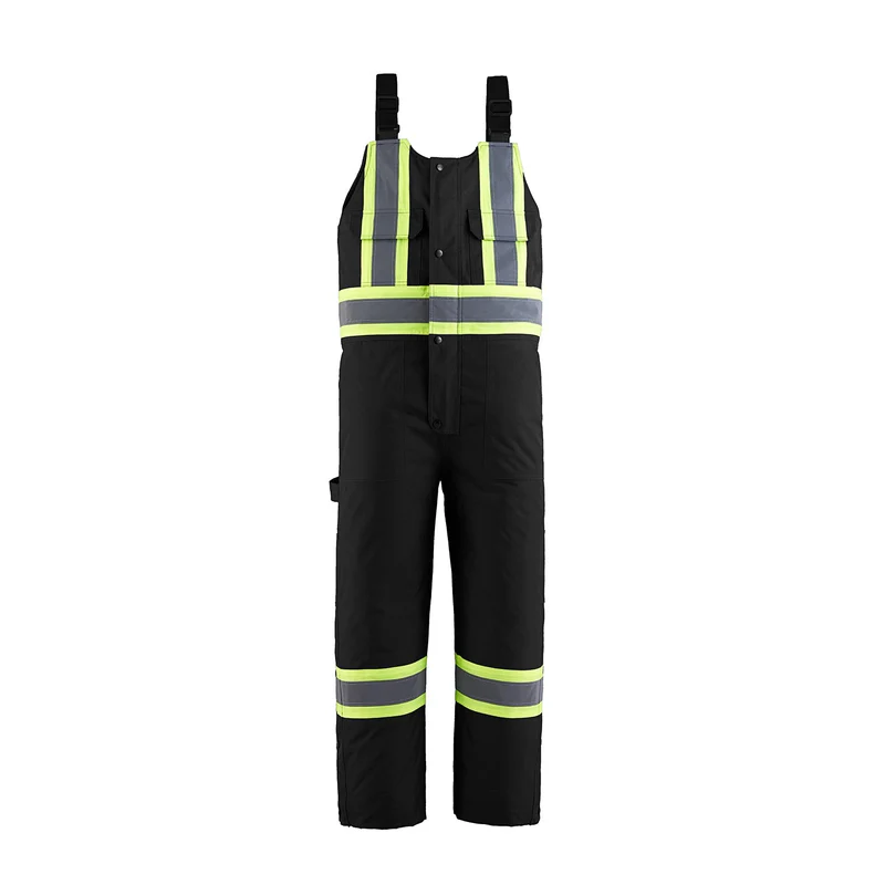 215 gsm – 6.3 oz./yd2 – 10.5 oz./lin. yd 100% polyester oxford 3000 mm waterproof rating, 3000 gsm breathability rating, wind resistant and water repellent finish. Insulation: 200 gsm 100% polyester. Fully seam sealed. Adjustable elastic shoulder straps. Chest pockets with flap closure, lower front patch pockets, back patch pockets and tool pockets. Interior chest pocket. 2 way YKK zippers at front fly and side seams. Elastic at back waist. Extendable hem panel to increase inseam 3”. 4” hi-vis contrast band with 2” reflective tape on front and back body and legs. Meets CSA standards.