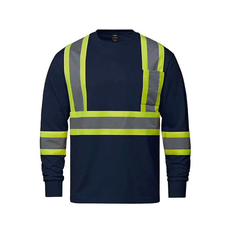 180 GSM - 5.3 oz./yd2 - 9 oz./lin. yd. 100% cotton jersey. Rib knit neckline with spandex for shape retention. Chest pocket. 2" retroreflective stripe with 4" fluorescent background stripe on front and back body and sleeves. Meets CSA standards. Side seamed.