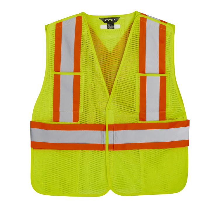 120 g/m² – 3.5 oz /yd² – 6oz / lin. yd. 100% polyester mesh. Upper left badge holder. 5 point tape fastener tear away safety design. 4 front storage pockets, Durable binding. D ring access slot on back.  4″ contrast hi vis tape with 2″ reflective tape on front and back body. Meets CSA standards.
