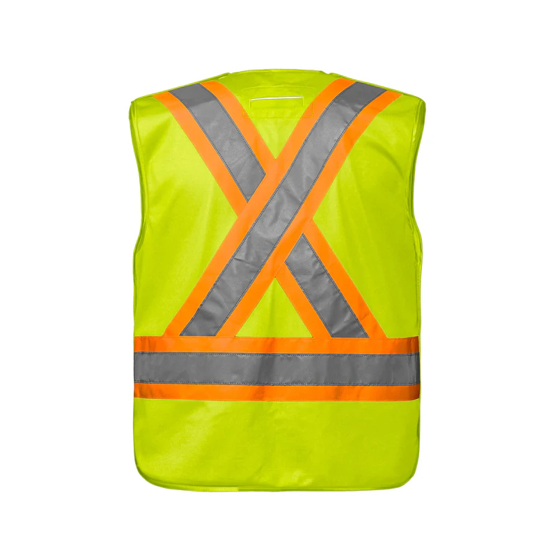 130 GSM - 3.8 oz./yd2 - 6.5 oz./lin. yd. 100% polyester tricot knit. 5-point tape fastener tear-away safety design. 4 front storage pockets.  Reflective radio clip strap on front shoulders. Durable binding. D-ring access slot on back. 2" retroreflective stripe with 4" fluorescent background stripe on front and back body. Meets CSA standards.