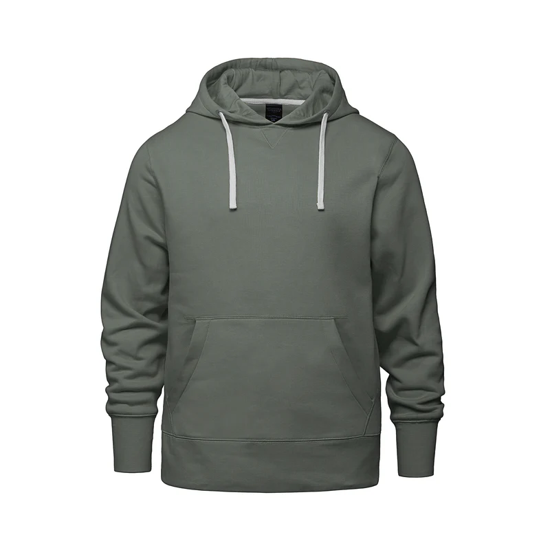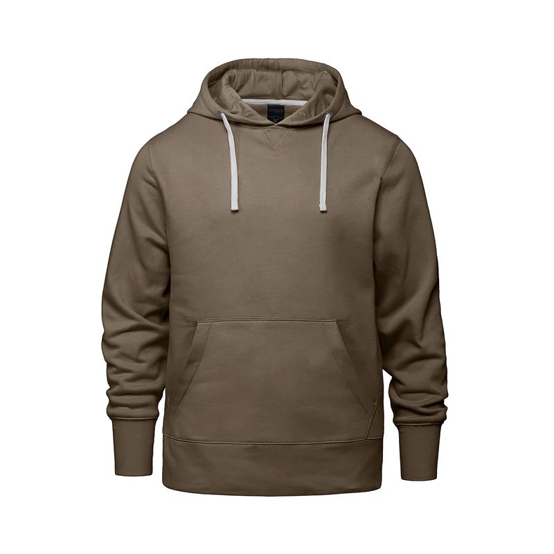 295 g/m2 – 8.7 oz./yd2 – 14.5 oz./lin. yd 80% cotton, 20% polyester fleece.  Double layer hood lined with jersey. Contrast chevron tape at neck seam. Adjustable contrast flat draw cord. Double layer ribbed cuff and hem with spandex.