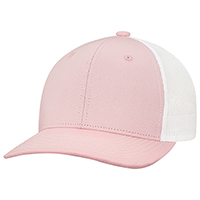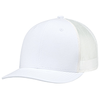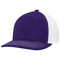 Deluxe buckram laminated front panels with pro-stitch, slightly curved peak with 8 rows of stitching, plastic adjustable back strap (S1).