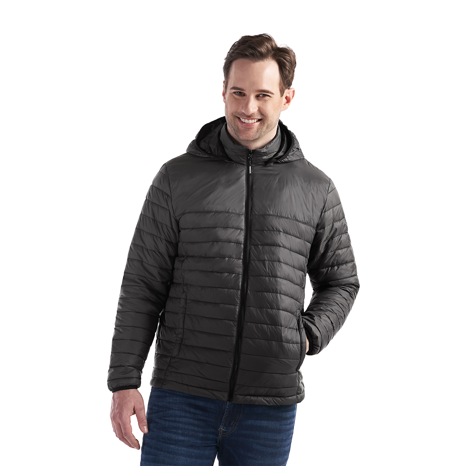 37 g/m2 – 1.1 oz./yd2 – 2 oz./lin. yd 100% nylon taffeta with water repellent finish. Insulation: lightweight 100% recycled polyester. YKK front zipper. Zippered side entry pockets. Zipper detachable Hood. Zocket embroidery access. Black elastic binding at hood opening and cuff.
