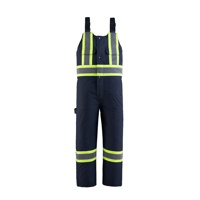 215 gsm – 6.3 oz./yd2 – 10.5 oz./lin. yd 100% polyester oxford 3000 mm waterproof rating, 3000 gsm breathability rating, wind resistant and water repellent finish. Insulation: 200 gsm 100% polyester. Fully seam sealed. Adjustable elastic shoulder straps. Chest pockets with flap closure, lower front patch pockets, back patch pockets and tool pockets. Interior chest pocket. 2 way YKK zippers at front fly and side seams. Elastic at back waist. Extendable hem panel to increase inseam 3”. 4” hi-vis contrast band with 2” reflective tape on front and back body and legs. Meets CSA standards.