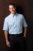 wrinkle-resistant finish, seven-button top set placket, button-down collar, matte pearl buttons, left chest patch pocket, overlock construction, tailored two-button adjustable cuffs and sleeve placket on long sleeve style, standard back yoke shaped shirt tail hem, 1" top stitch hemmed cuffs on short sleeve styles, easy care machine wash and dry, 4.4 oz.
