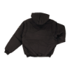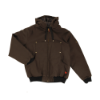 100% cotton 12 oz premium duck with durable water repellent finish, lining: quilted 6 oz polyester insulation, triple stitched, brass rivets at stress points, brass zipper, three piece attached hood with draw cord, two chest pockets and two front scoop pockets, inside pocket and media pocket, pencil pocket on sleeve, action back, rib knit waist and cuffs.